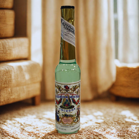 Vintage bottle of Florida Water on a carpeted floor with a blurred background