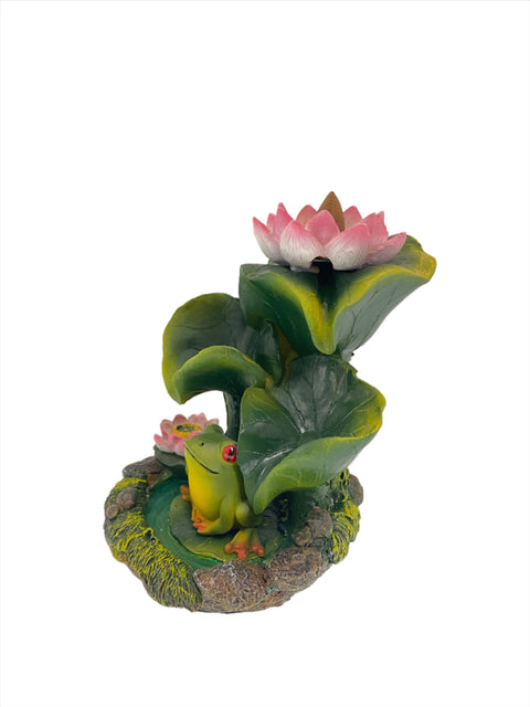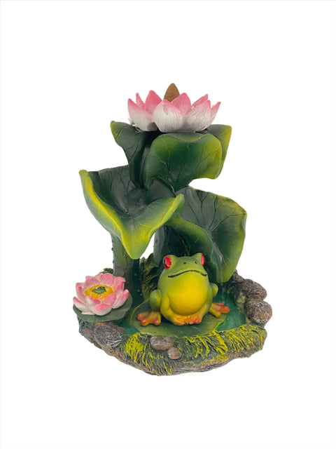 Charming frog on a lily cushion Backflow incense burner! Pair it with your top Backflow incense cone and watch the smoke cascade over the Lilly cushions! Frog and Lily Pad poly-pitch backflow incense burner, 6 inches tall and 5 inches wide. Works with reverse cones, which have an opening in the base permitting the smoke to stream descending into the burner like a cascade.